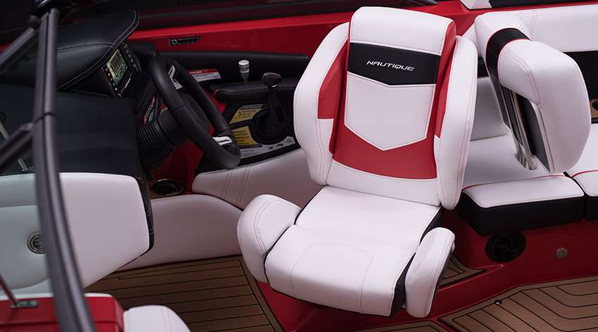 Comfort is a priority with seating for twelve in an interior that combines aesthetically pleasing elements with function. Compartmentalized storage provides protection and easy access to gear keeping elegant soft-touch flooring and walkways clutter-free. Intuition takes control at the helm as our racing-inspired helm seat puts the first-class technology of our Nautique LINC system in the perfect position.EXTERIOR