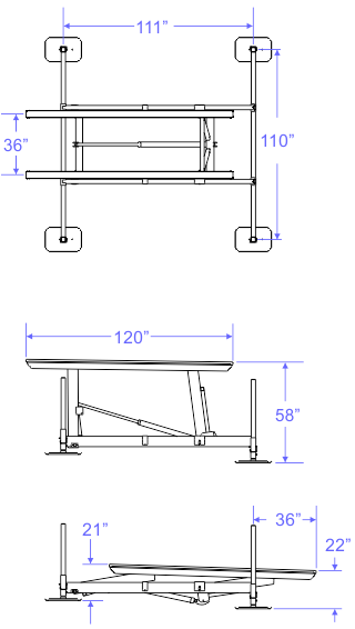 This 4,500 lb free standing self-contained boat lifts feature our patented Over-Center™ gravity lock, 'balanced load' H-frame technology, single aluminum-bore hydraulic cylinder design, stainless steel cylinder/hose fittings, duplex-bonded synthetic hydraulic hoses, full length rubber or carpeted bunks and marine grade hardware.