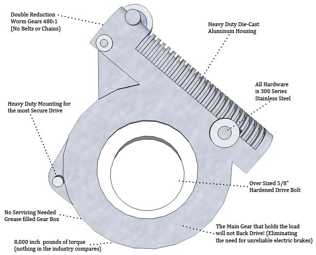 The Golden Sea-Drive® is shaft-mounted with dual flanges to accommodate different drive positions. The drive is connected to the lift shaft with a 5/8" grade "5" cross bolt. This is the largest drive bolt in the industry. The Golden Sea-Drive® produces over 8000 inch pounds of torque and would break the smaller bolts used by other boat lift companies.